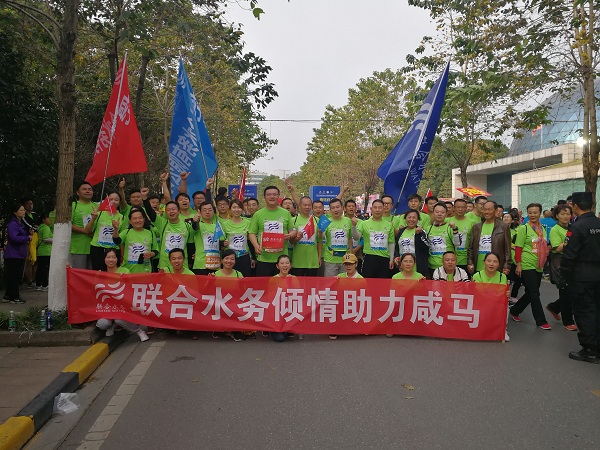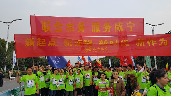 11月11日上午8點(diǎn),2017年咸寧國(guó)際溫泉馬拉松賽在咸寧市人民廣場(chǎng)鳴槍開(kāi)跑,本次活動(dòng)吸引了全世界的1.2萬(wàn)人參加,聯(lián)合水務(wù)集團(tuán)副總裁劉猛、陳樵、James Beeson先生及旗下6個(gè)項(xiàng)目公司的63名參賽隊(duì)員匯集香城泉都,代表聯(lián)合水務(wù)傾情助力本次馬拉松大賽。 當(dāng)天7:20,集團(tuán)63名參賽人員和咸寧公司70名啦啦隊(duì)和服務(wù)人員,在起點(diǎn)人民廣場(chǎng)集中,高舉“新起點(diǎn)、新征程、新時(shí)代、新作為”、“聯(lián)合水務(wù),服務(wù)咸寧”的橫幅,大家步伐整齊,揮舞彩旗,方陣格外引人注目,為本屆馬拉松賽事增添了一抹亮麗的風(fēng)景。